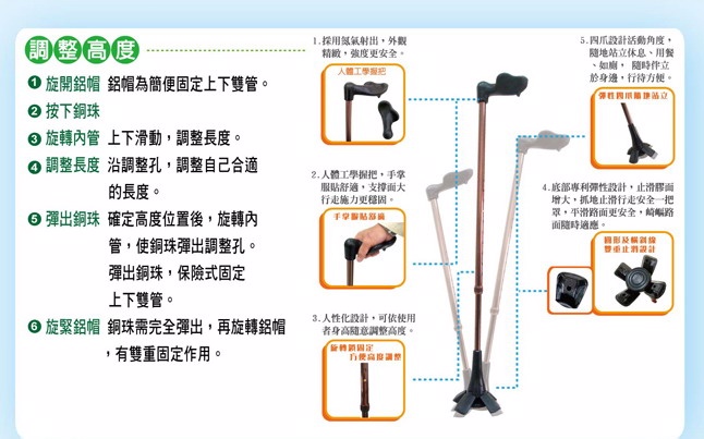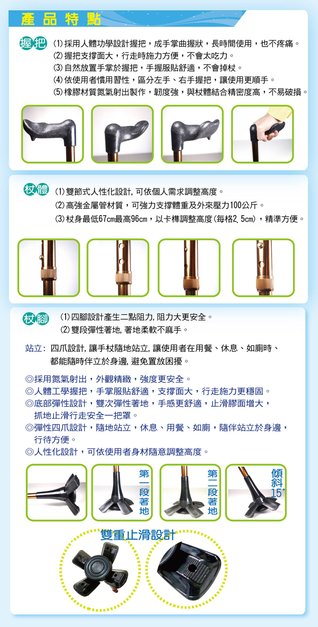 人體工學握把專利四腳設計 採用人體工學設計握把 握把支撐面大高強金屬管材質 行走時施力方便