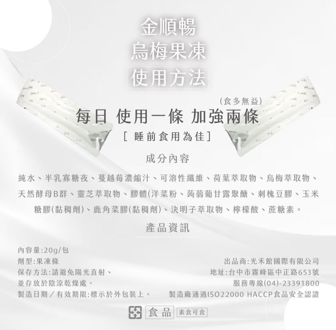 內容量:20g/包 果凍酵母菌配方,腸道保健每日1包(可以睡前吃)。
